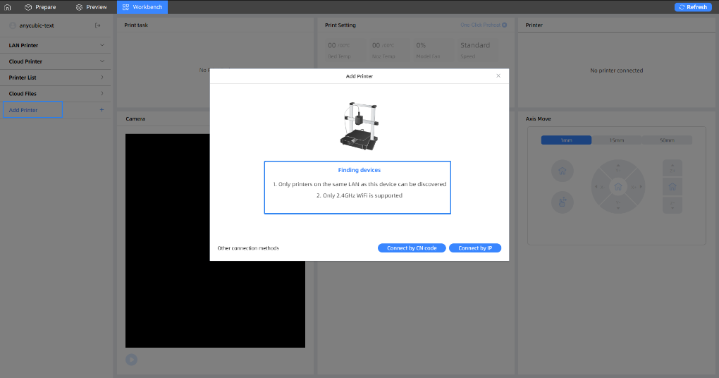 - В разделе Workbench → Add Printer войдите в свой аккаунт Anycubic (если требуется).